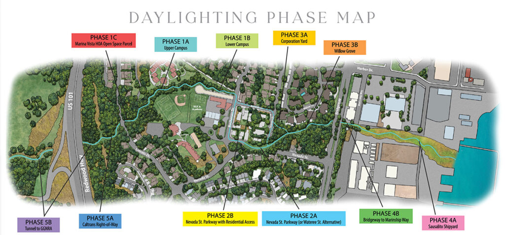 Willow Creek flows from its source, above Hwy 101, to the edge of Richardson Bay, running primarily underground in concrete culverts. You can see remnants of the old creek in the open space parcel at the corner of Bridgeway and Nevada Street. Water in this open channel runs year-round through Willow Grove and sustains a vibrant natural ecosystem that provides habitat for animals and people alike.
